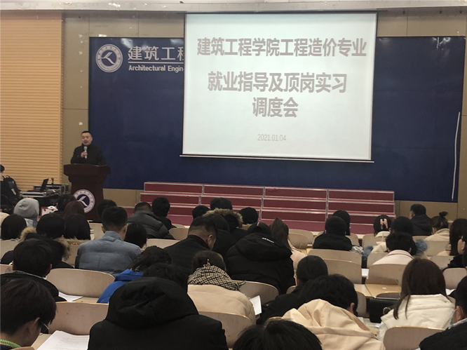 1月4日下午,建筑工程学院在海润楼二楼报告厅召开2021届工程造价专业就业指导讲座及顶岗实习工作调度会,建筑工程学院副院长杨志刚出席会议,就业联络员、就业指导教师及全体工程造价专业学生参加会议会议由工程造价专业主任刘永坤主持。