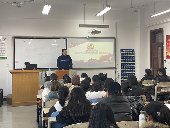 支部书记讲党课,是党的优良传统,是新形势下加强党员教育的有效途径。12月20日下午,人文与旅游学院学生工作党支部在和润楼A407开展了以“入党先进分子如何向组织靠拢”为主题的党课活动。参加本次党课的有学院100余名入党积极分子、入党先进分子。