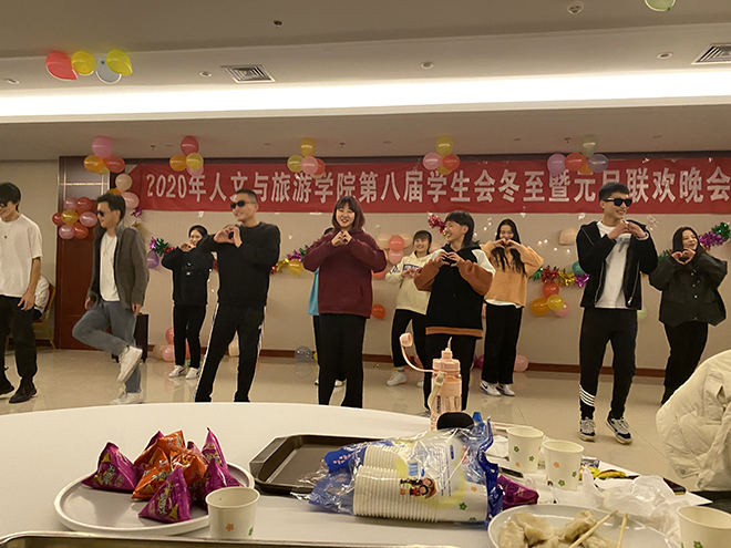 为了进一步弘扬中华民族的民俗文化,营造良好的校园文化氛围,让学生在集体的温暖中度过异地的传统节日、感受家的温暖、集体的温馨,缓解思乡之情,12月20日下午,人文与旅游学院学生会全体成员在校内餐厅三楼举办冬至暨元旦联欢会,部分辅导员,班主任参加了本次活动。