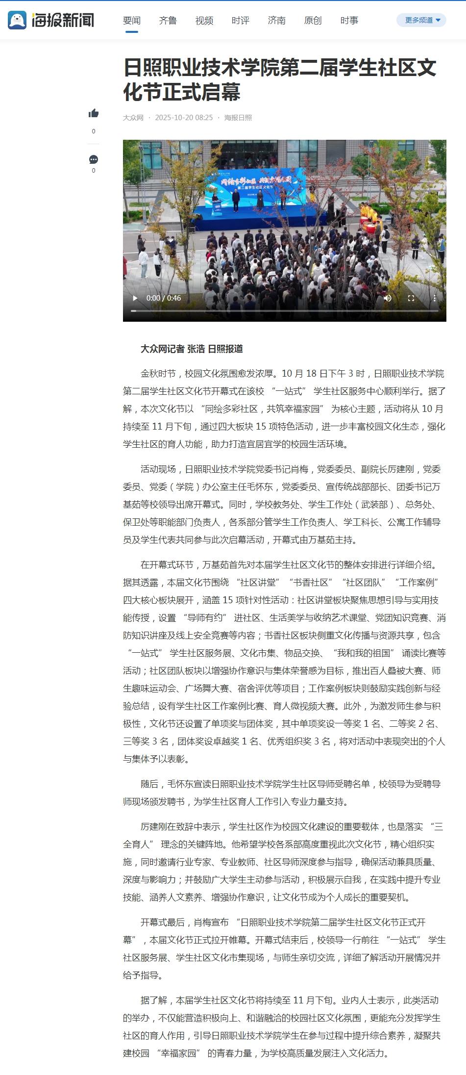 海报新闻报道:日照职业技术学院第二届学生社区文化节正式启幕