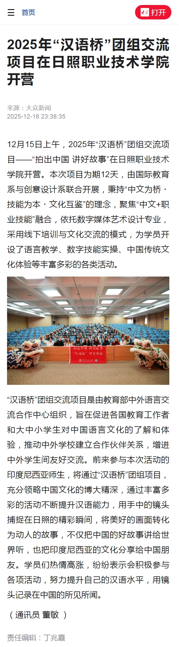大众新闻客户端报道:2025年“汉语桥”团组交流项目在日照职业技术学院开营