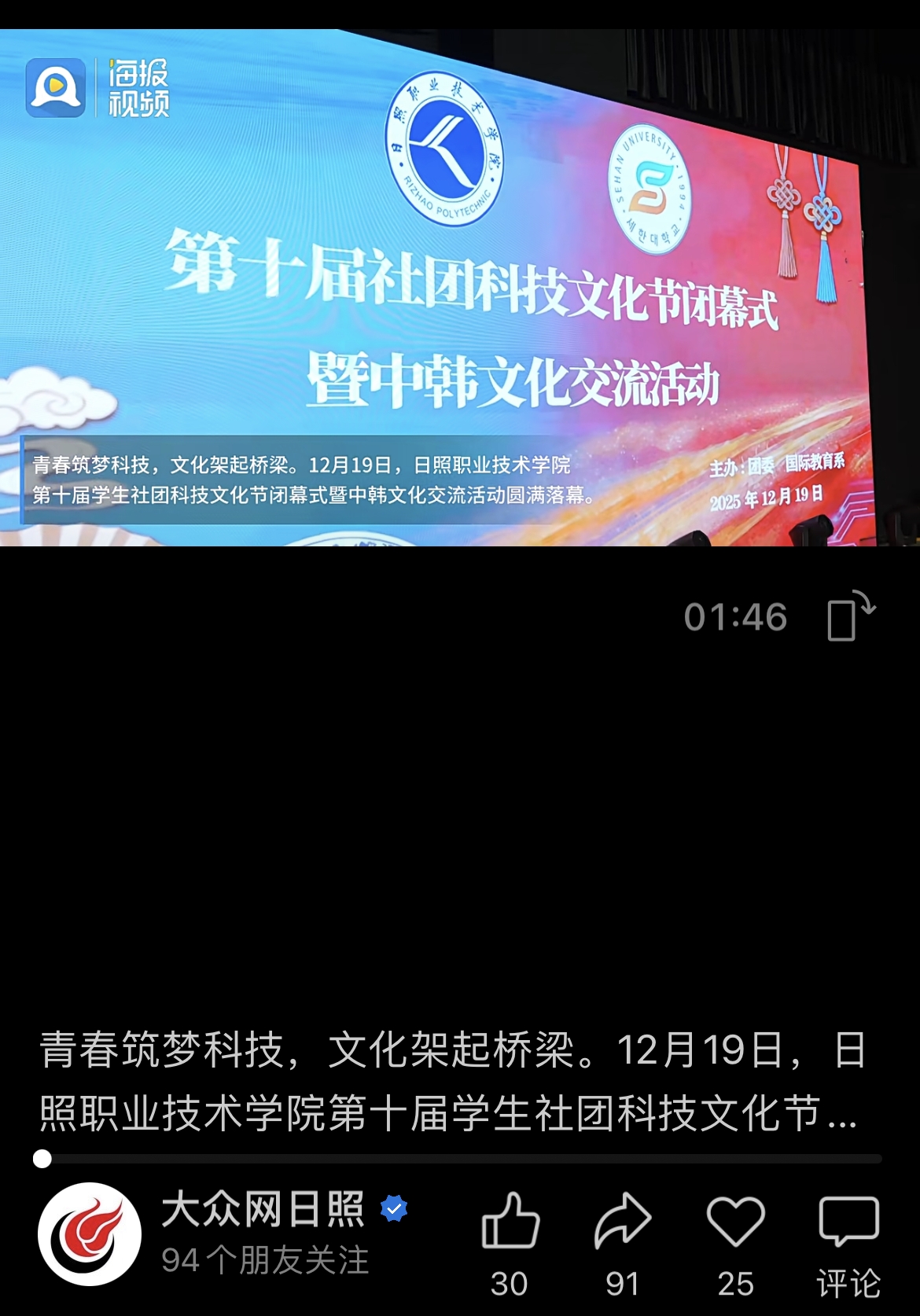 大众网视频号报道:日照职业技术学院第十届学生社团科技文化节暨中韩文化交流活动落幕