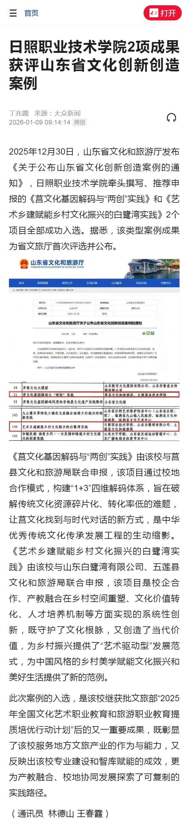 大众新闻客户端报道:日照职业技术学院2项成果获评山东省文化创新创造案例