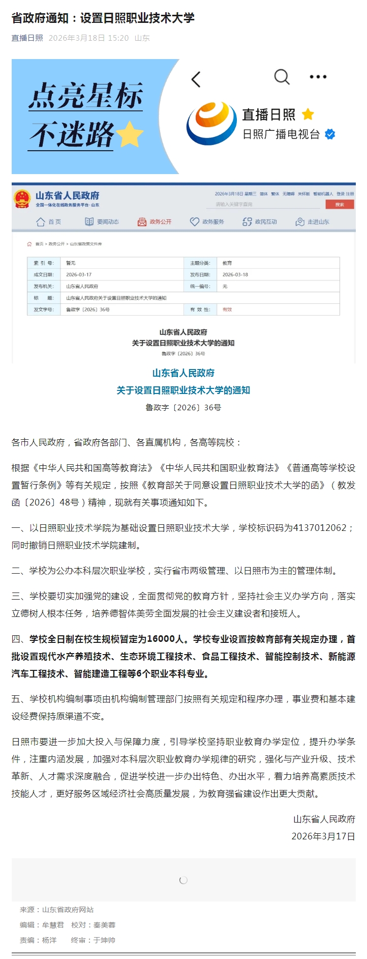 直播日照报道:省政府通知:设置日照职业技术大学