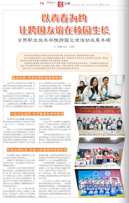 日照日报黄海晨刊报道:以青春为约 让跨国友谊在校园生长——日照职业技术学院跨国交流活动成果丰硕